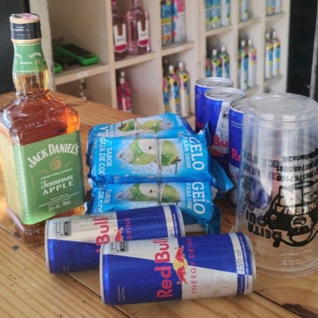 1 Jack de maçã, 10 gelos, 5 red bul , 2 copos