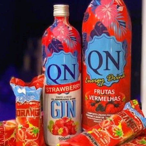 1 Energético Qn De Morango, 5 Gelos De Morango, 1 Gin Qn De Morango, 2 Copos