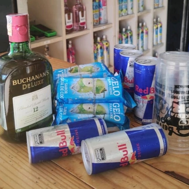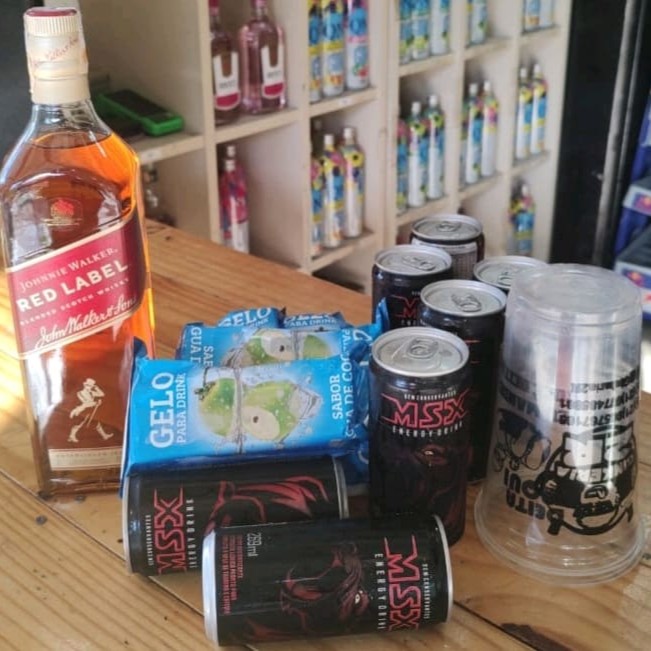 1 Red Label, 5 gelos, 1 energético, 2 copos