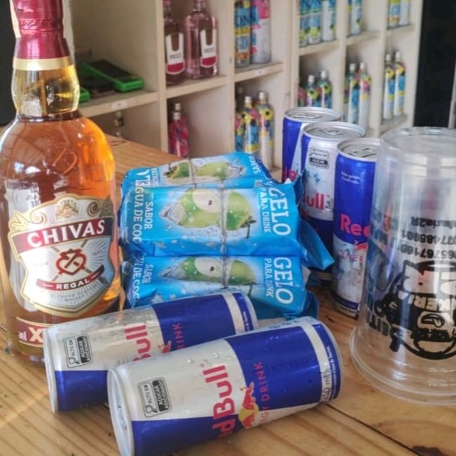 1 Chivas, 10 gelos, 5 red bul, 2 copos