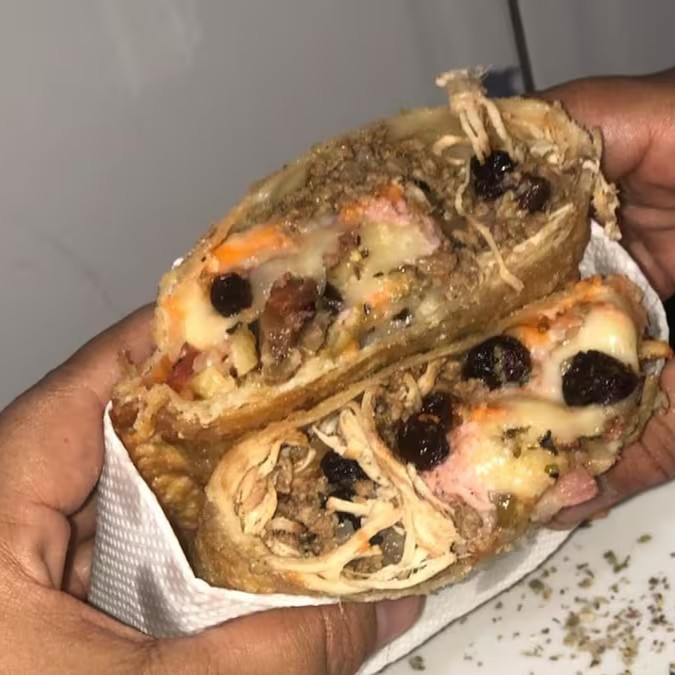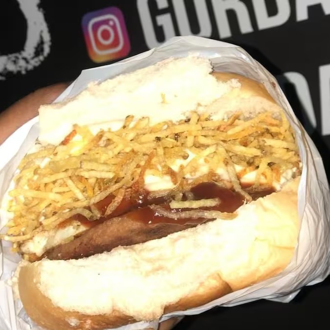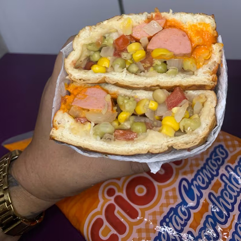 Pão maior, frango, bacon, calabresa, cheddar, Catupiry, tomate, cebola, milho, ervilha, molho shoyu, molho de alho, ketchup, maionese.
