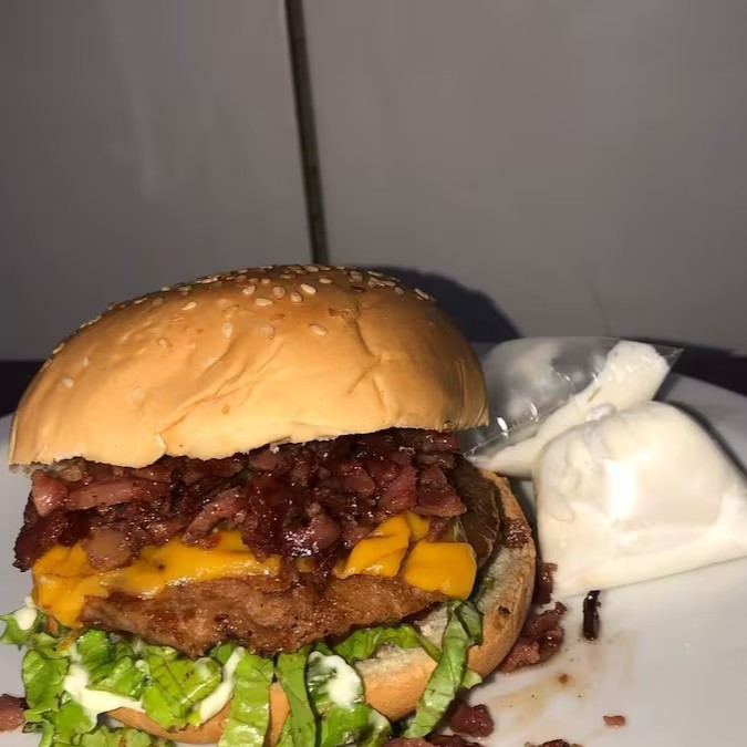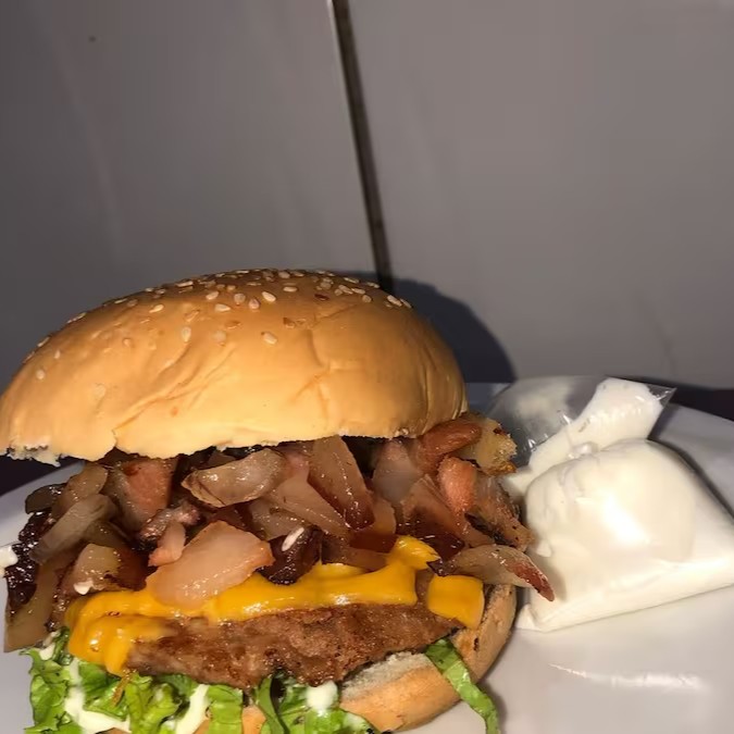 Pão de corte, Carne, Cheddar Cremoso, Bacon, Alface, Tomate, Maionese