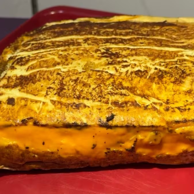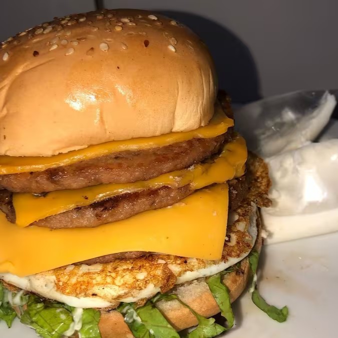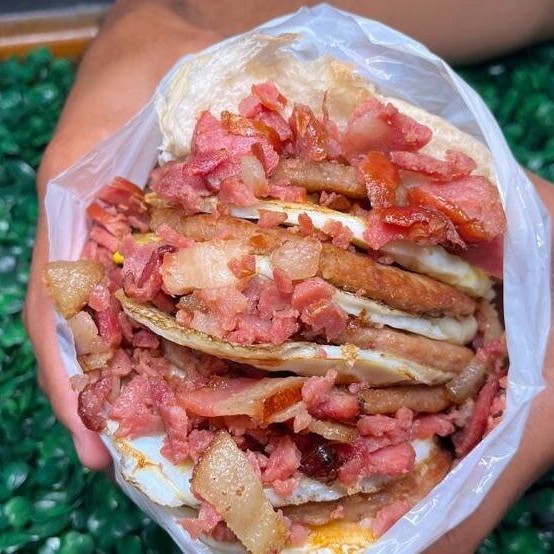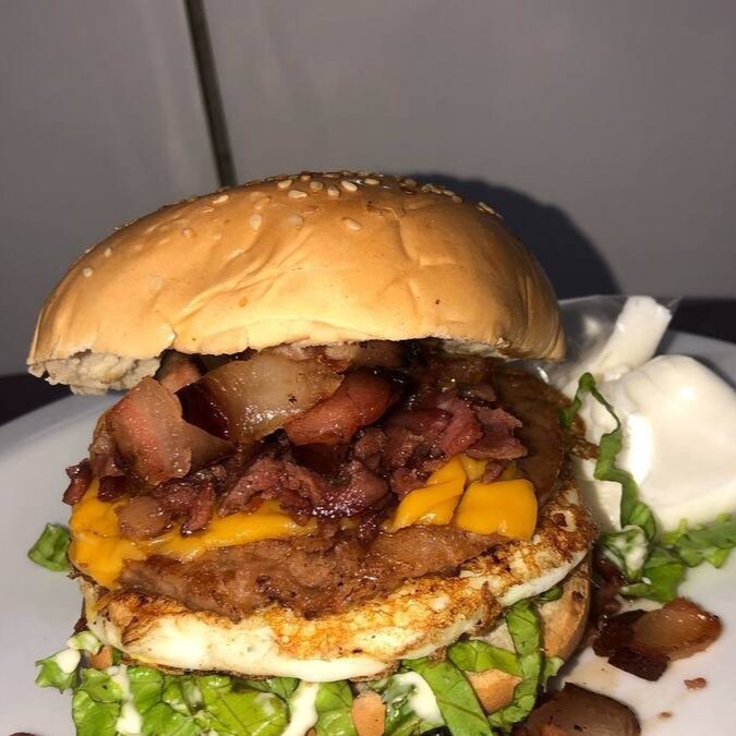 Pão de corte, 2 Carnes, Cheddar Cremoso, Ovo, Bacon, Calabresa Alface, Tomate, Maionese