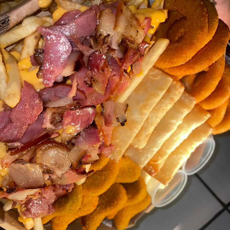 6 pasteis, 8 nugget, 8 Onion rings 400g batata maluca