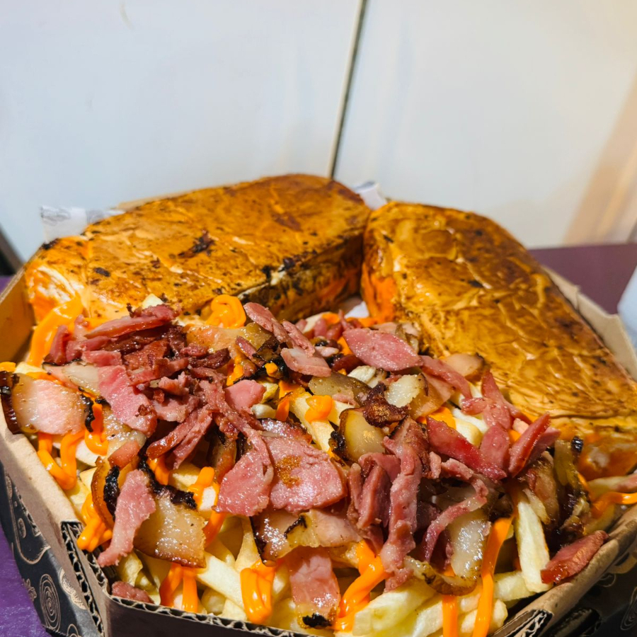 Pão, Carne, Cheddar Cremoso, Mussarela, Bacon, ketchup, Maionese e Batata Palha