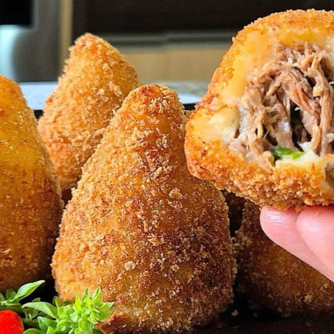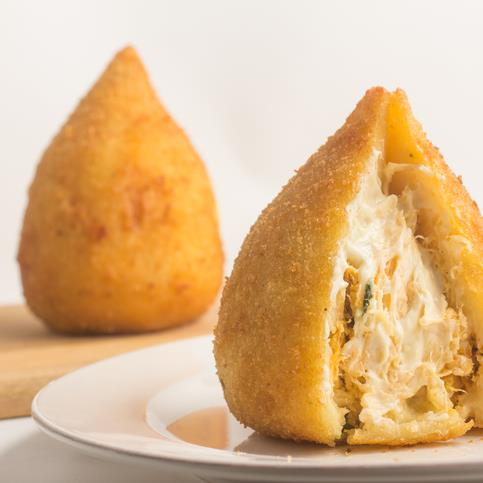 Deliciosa coxinha cremosa por dentro e crocante por fora esse combo e composto de 2 coxinha uma de frango com creme cheese e outra de costela com creme cheese envolvida na farinha panko