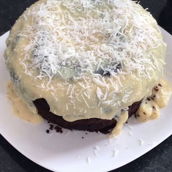 Massa preta amanteigada e coberto de brigadeiro de ninho e fio de nutella