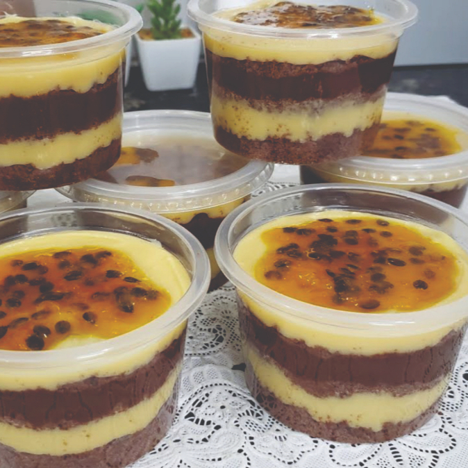 Copo da Felicidade – Maracujá & Chocolate 🍫💛 Camadas irresistíveis de brigadeiro de maracujá, brownie macio e chocolate cremoso, formando a combinação perfeita entre o azedinho do maracujá e o doce do chocolate. Uma verdadeira explosão de sabor em cada colherada! ✨