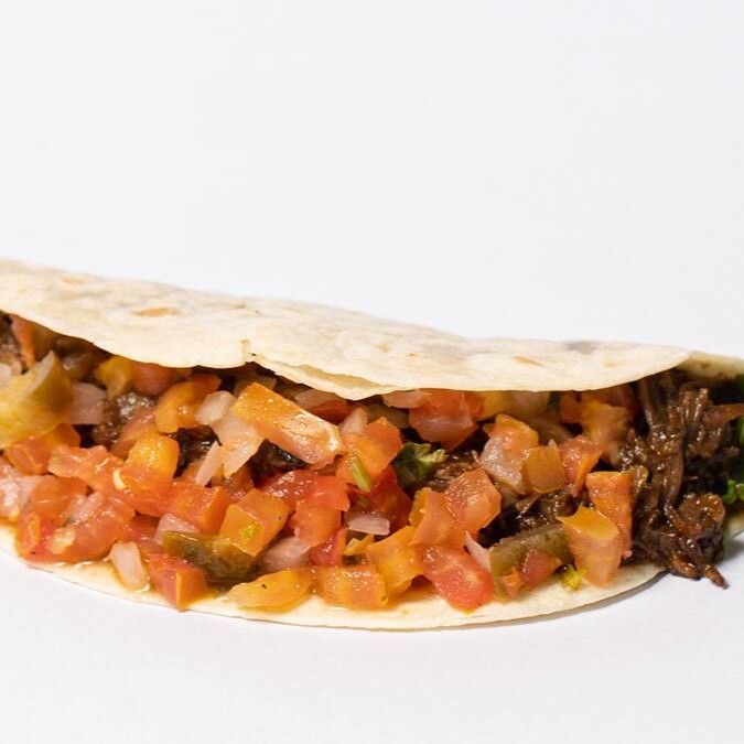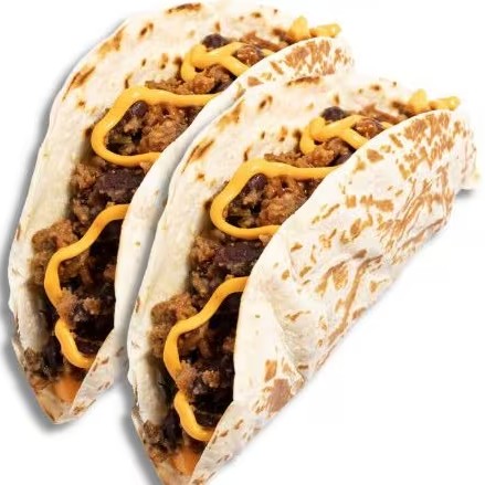 Tortilha de trigo (Soft), chilli con carne de soja (molho de carne de soja com feijão), cheddar e molho de pimenta. Nível 1 de 5 de picância, é possível reduzir. Excelente opção para os vegetarianos - Comida vegetariana Tacos, é um prato tradicional da culinária mexicana que lembra um pouco o pastel, uma massa de trigo redonda, recheada e dobrada ao meio!