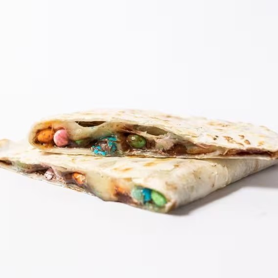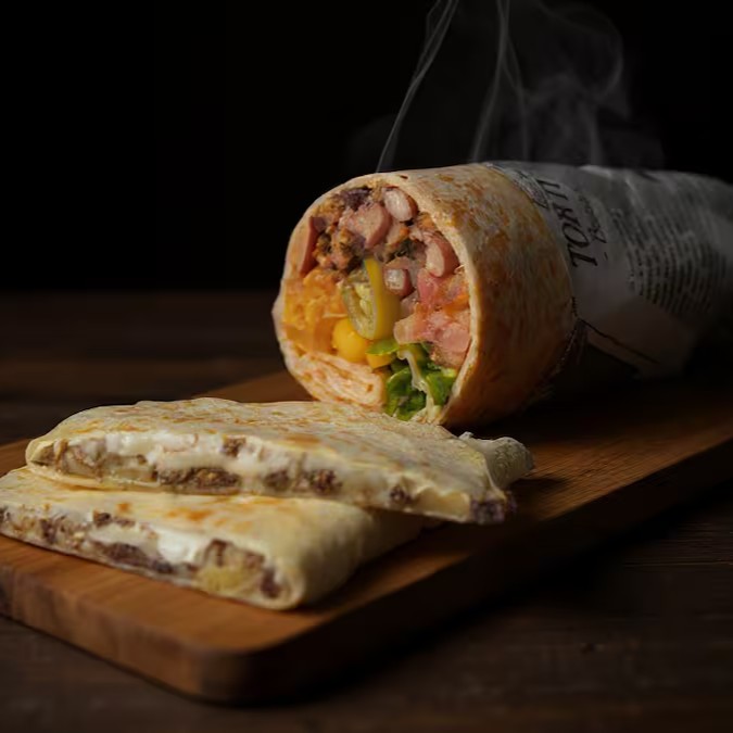 1 Burrito Classic (Tortilla de trigo, carne com feijão, bacon crocante, cheddar, barbecue, alface, tomate, pimenta jalapeño, e molho de pimenta 1 Quesadilla Ovomaltine (Tortilla de trigo, chocolate branco, Ovomaltine e mussarela)