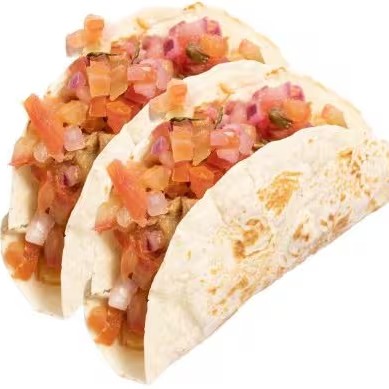 Tortilha de trigo (Soft), pernil em cubos com abacaxi e pico de galo. *imagem meramente ilustrativa* Tacos, é um prato tradicional da culinária mexicana que lembra um pouco o pastel, uma massa de trigo redonda, recheada e dobrada ao meio! Esse prato não contém lactose, é um lanche ótimo e saudável.