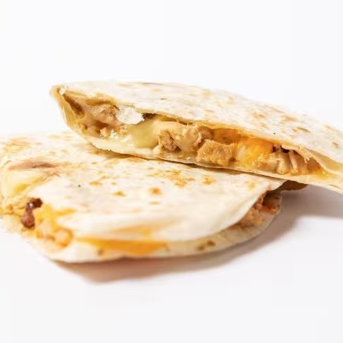 Duas Quesadillas Pollo compostas por: Tortilha de trigo, frango em tiras temperado, mussarela, bacon crocante, cheddar e molho de pimenta. Nível 1 de 5 de picância, é possível reduzir - não acompanha guacamole e sour cream. Montagem parecida com a tapioca, o calzone ou o crepe francês, onde uma massa redonda é recheada, dobrada ao meio e levada para a chapa.
