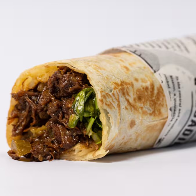 Tortilla de Trigo, Barbacoa (carne bovina desfiada com molho apimentado), Pico de Galo (contém pimenta) e Mussarela. Nível 2 de 5 de picância, é possível reduzir.