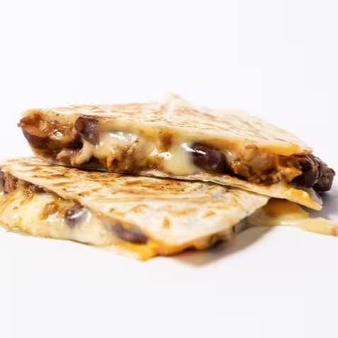 Duas Quesadillas Chilli Veggie compostas por: Tortilha de trigo, mussarela, Chilli con Carne de Soja (contém feijão), Pico de Galo (contém Jalapeño) e Milho Verde. Nível 1 de 5 de picância, é possível reduzir - não acompanha guacamole e sour cream. Montagem parecida com a tapioca, o calzone ou o crepe francês, onde uma massa redonda é recheada, dobrada ao meio e levada para a chapa. Excelente opção para os vegetarianos - Comida vegetariana!