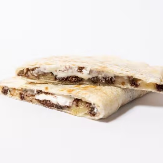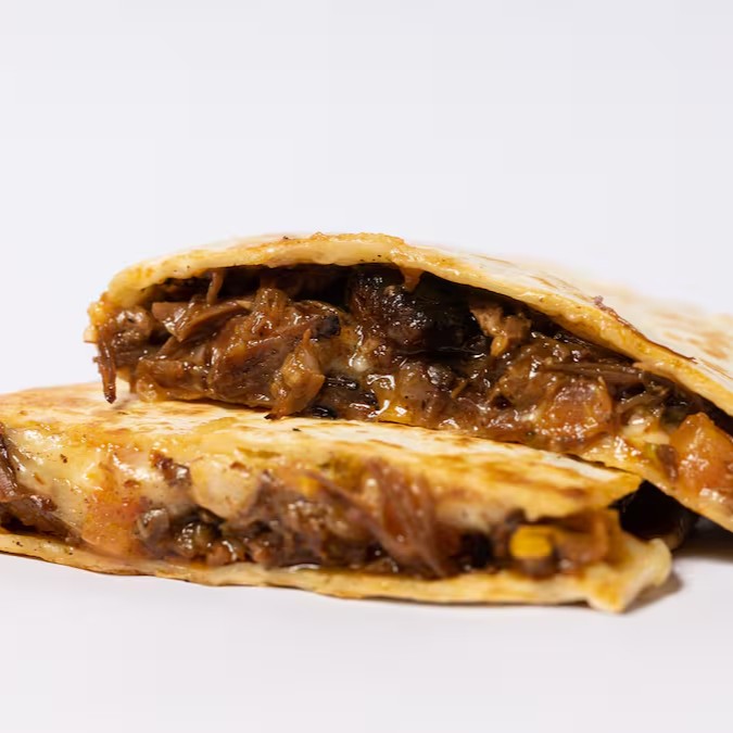 Duas Quesadillas Chilli con Carne compostas por: Tortilha de trigo, chili com carne (molho de carne com feijão), mussarela, cheddar e molho de pimenta. Nível 1 de 5 de picância, é possível reduzir. - não acompanha guacamole e sour cream. Montagem parecida com a tapioca, o calzone ou o crepe francês, onde uma massa redonda é recheada, dobrada ao meio e levada para a chapa.