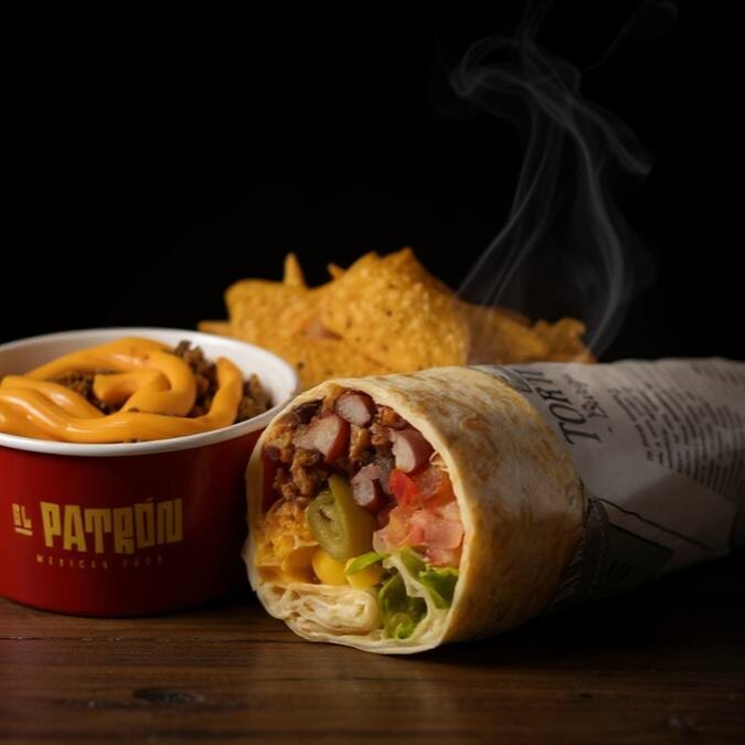 1 Burrito Classic (Tortilla de trigo, carne com feijão, bacon crocante, cheddar, barbecue, alface, tomate, pimenta jalapeño, e molho de pimenta 1 Nachos Dip Classic (Chilli con carne, cheddar, molho de pimenta e tortilla chips)