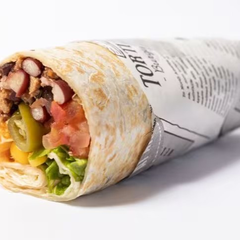 Tortilla de trigo, chilli com carne de soja (molho de carne de soja com Feijão), milho verde, cheddar, alface, tomate, pimenta jalapeño e molho de pimenta. Nível 3 de 5 de picância, é possível reduzir. *imagem meramente ilustrativa* - não acompanha guacamole e sour cream. O Burrito, que parece um wrap ou shawarma, é a marmita mexicana (proteína, massa e salada), excelente opção de comida saudável para pedir no delivery. Costuma agradar o paladar daqueles que gostam da culinária brasileira. Pensou em pedir um sushi ou uma pizza? Que tal hoje conhecer um Burrito? Essa opção é vegetariana, mas também pode virar vegana (sem lactose também), é só pedir para retirar o cheddar.