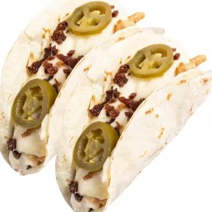 Tortilha de trigo (Soft), pasta de feijão, tiras de frango, bacon crocante, pimenta jalapeño e molho 4 queijos. Nível 2 de 5 de picância, é possível reduzir. Tacos, é um prato tradicional da culinária mexicana que lembra um pouco o pastel, uma massa de trigo redonda, recheada e dobrada ao meio!