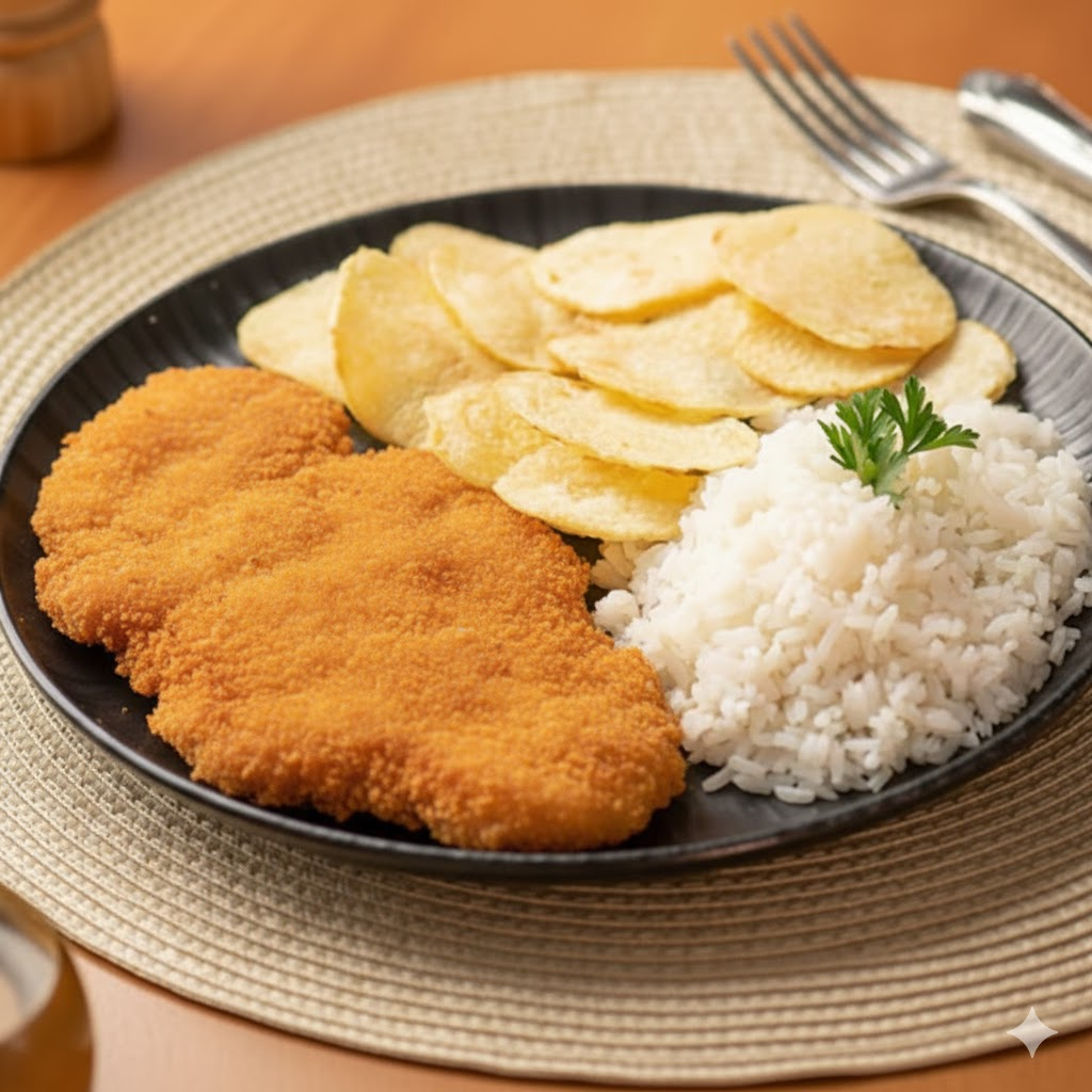Filé de frango empanado e frito, com casquinha crocante por fora e suculento por dentro. Acompanha arroz branco, feijão fresquinho e farofa tradicional da casa. O feijão é enviado em uma embalagem de 140gr separada.