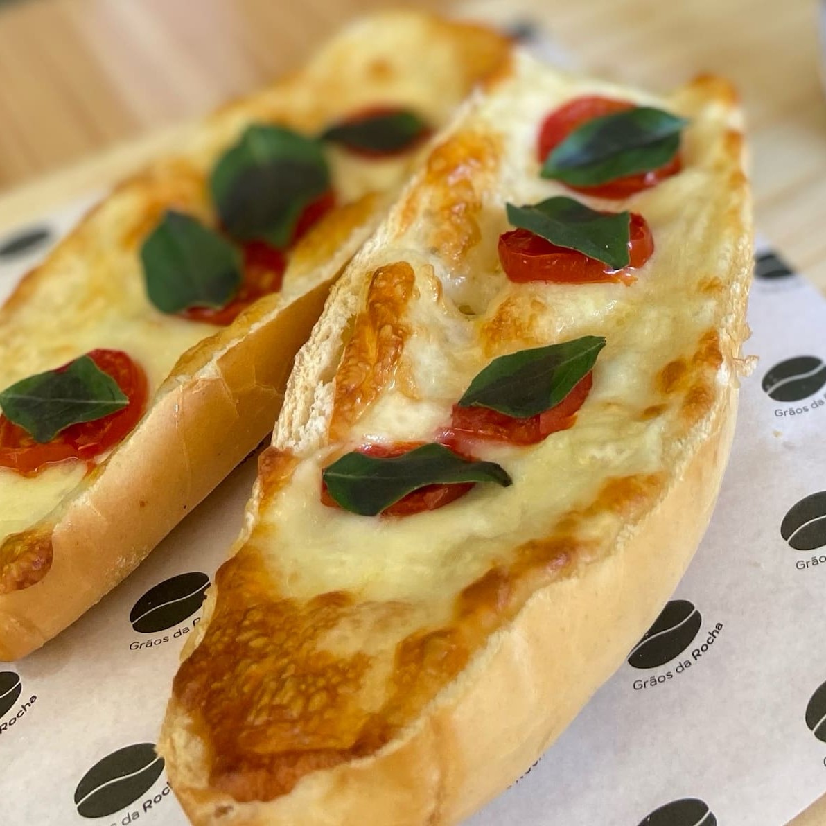 Bruschetta crocante com queijo muçarela, tomate fresco e manjericão.