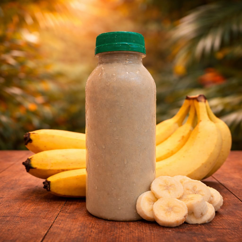 Shake com banana, doçura natural, textura leve e refrescante. Ingredientes: AMENDOIM, LEITE EM PÓ, CASTANHA, GUARANÁ EM PÓ, XAROPE DE GUARANÁ, BANANA E GELO.