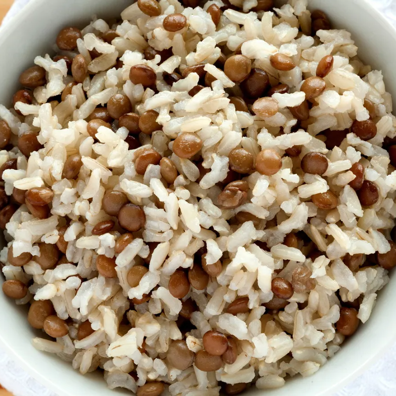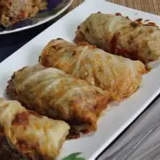 Arroz com lentilha com cebola caramelizada e charuto de repolho