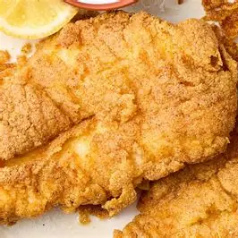 Filé de peixe frito à milanesa, acompanhado de arroz, feijão e batata frita