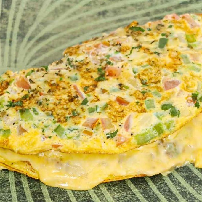 Omelete recheado com tomate, cebola e queijo, acompanhado com feijão, arroz e fritas