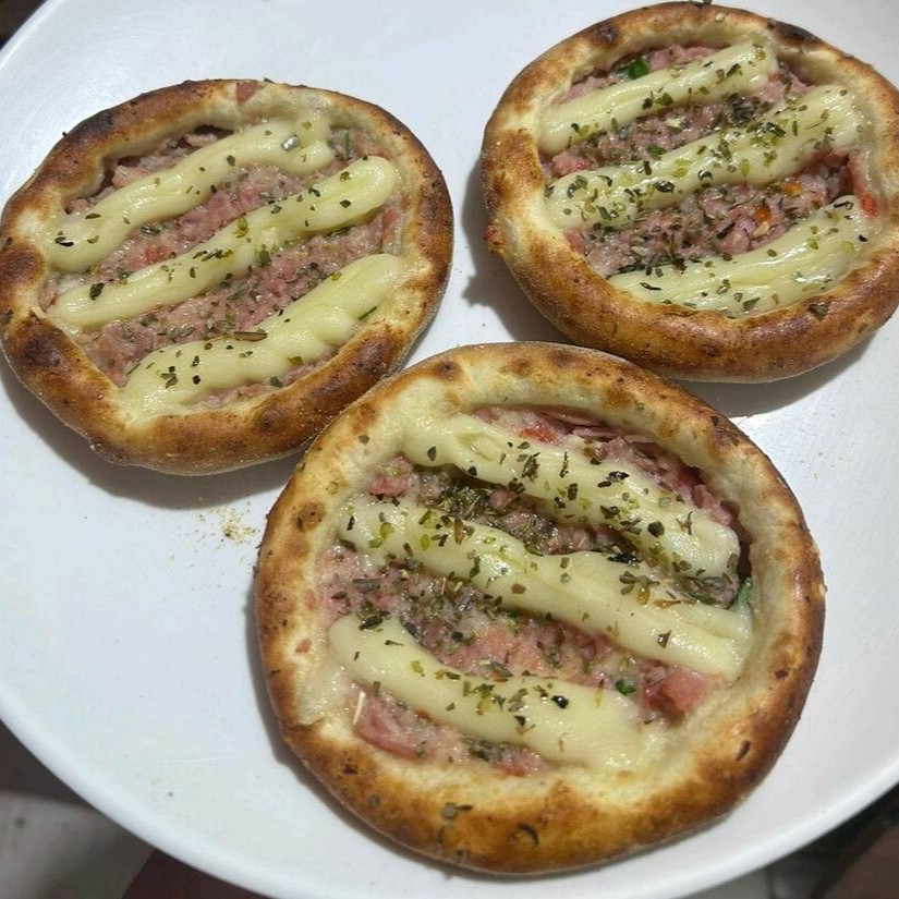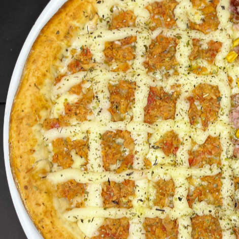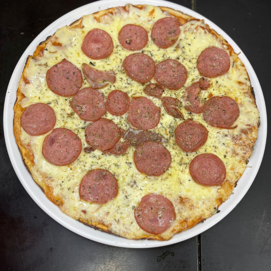 Calabresa triturada com cebola, tomate e mussarela.