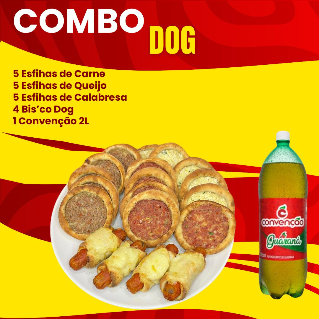 5 esfihas de carne, 5 esfihas de calabresa, 5 esfihas de queijo, 4 bisco dog e 1 Convenção 2l