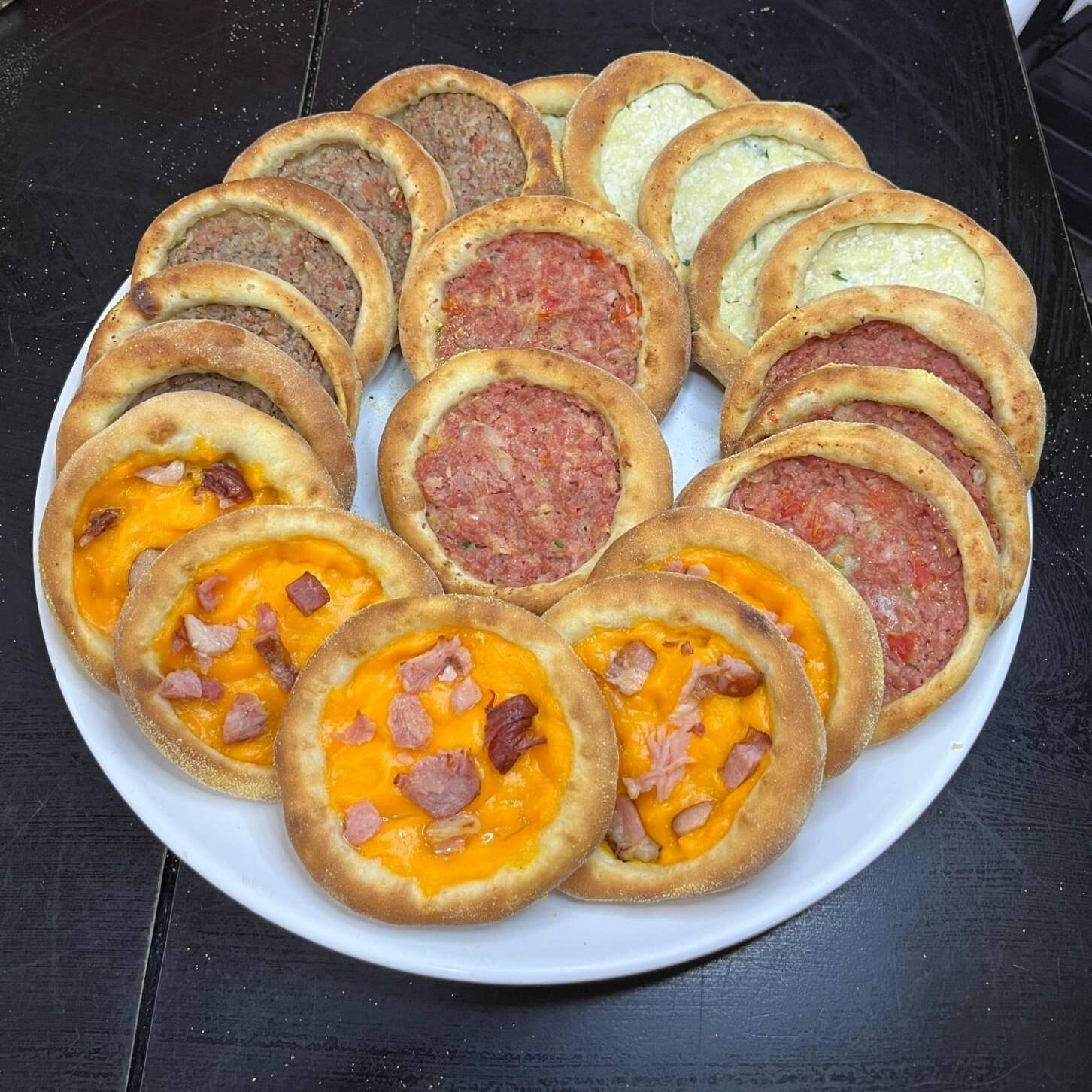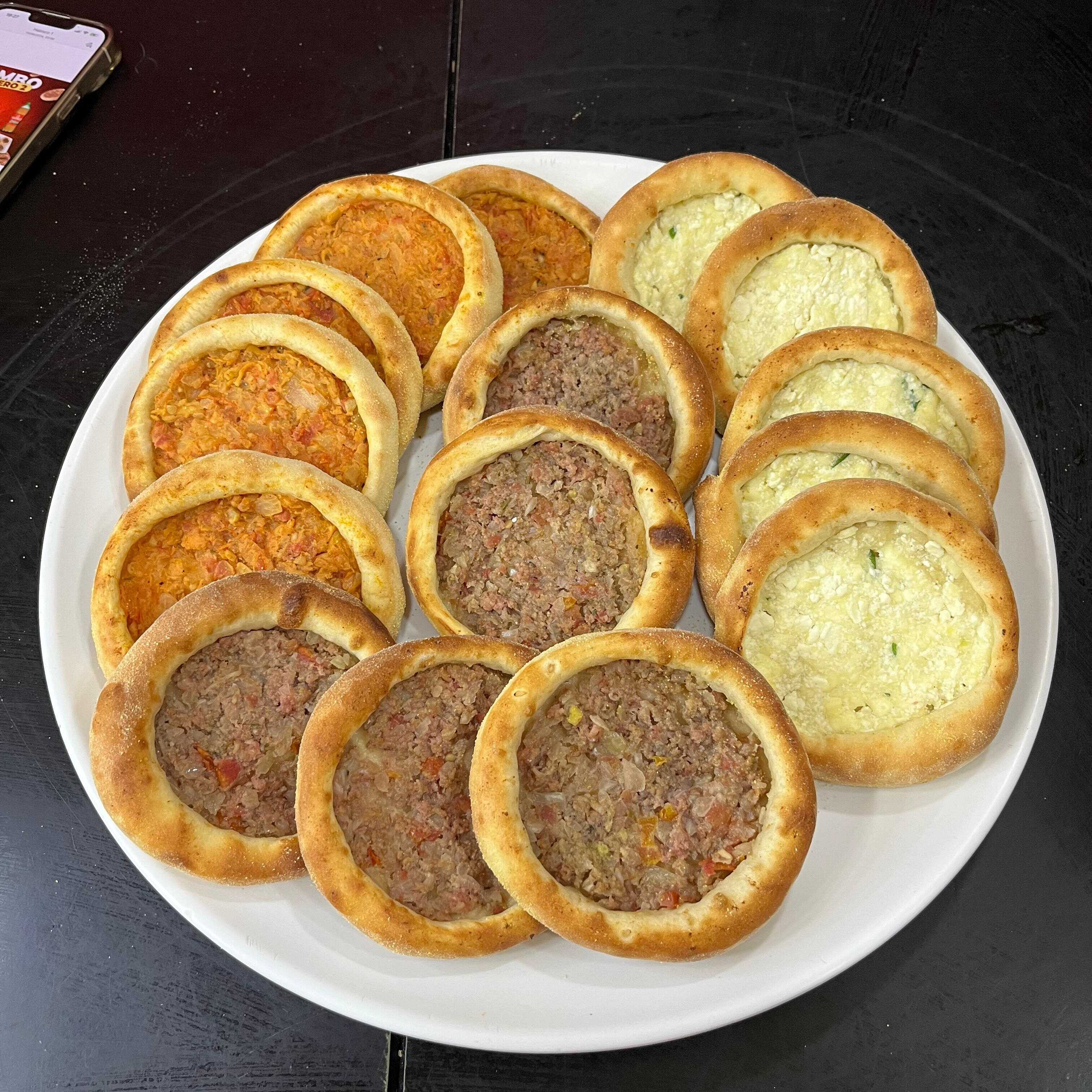 10 esfihas de carne, 10 esfihas de queijo minas, 10 esfihas de cheddar com bacon e 1 coca cola 2L