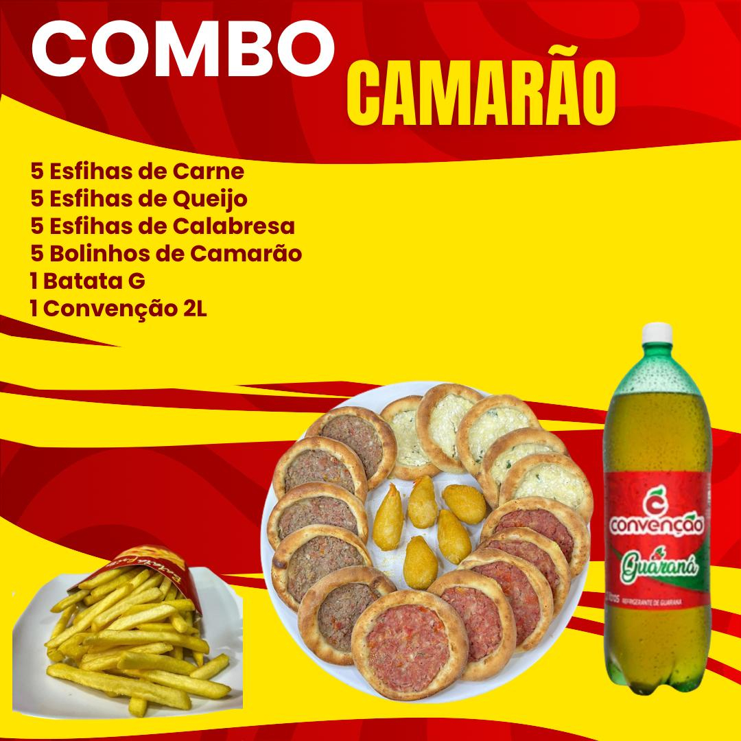 5 esfihas de carne, 5 esfihas de calabresa, 5 esfihas de queijo, 5 coxinha de camarão, 1 batata G, 1 Convenção 2 L