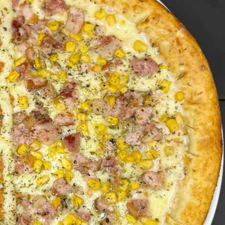 Mussarela, molho, Bacon e milho.