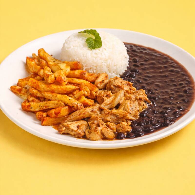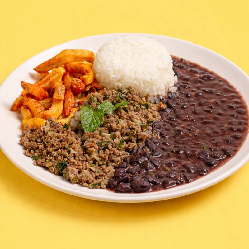 Nesse prato tem: Arroz (180g), Feijão (80g), Carne Moída (100g) e Batata Frita temperada ao modo Libanês (50g)
