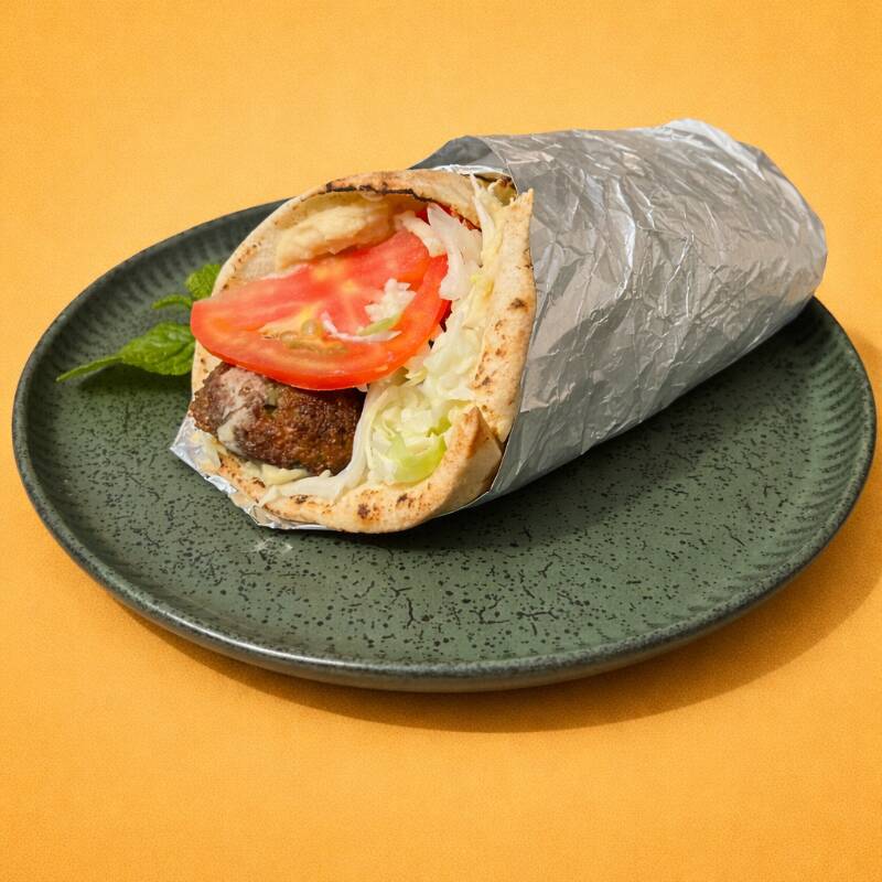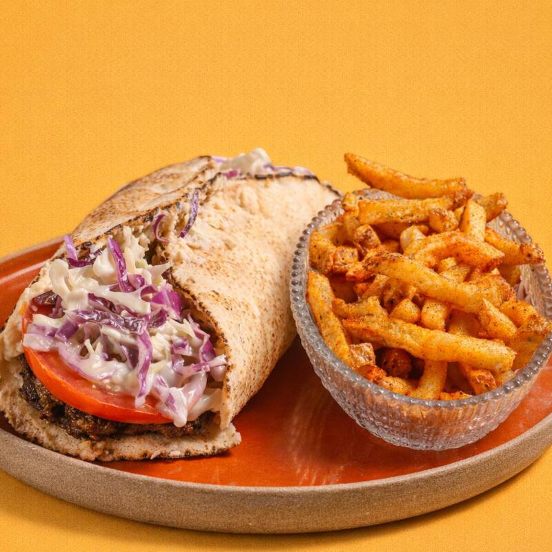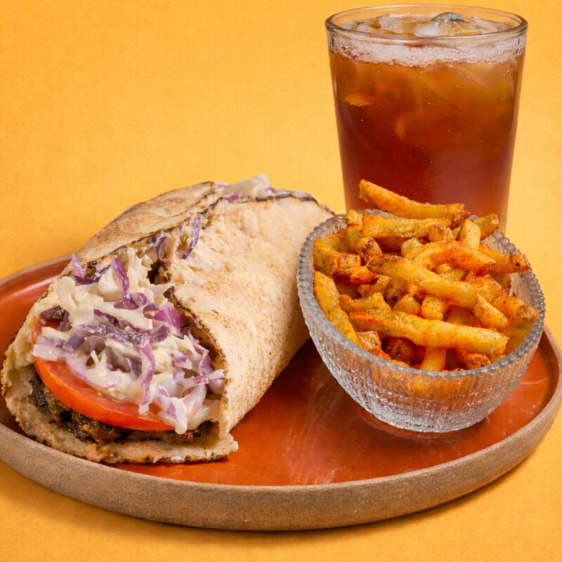 Opção VEGANA 1 kebab de falafel + batata frita temperadinha (100g) + Mate da casa com limonada (250ml) Nosso kebab de falafel é Vegano feito com falafel no pão pitta, hommus tahine, salada de repolho na emulsão de alho, tomate e molho tahine. Uma verdadeira explosão de sabores!!!