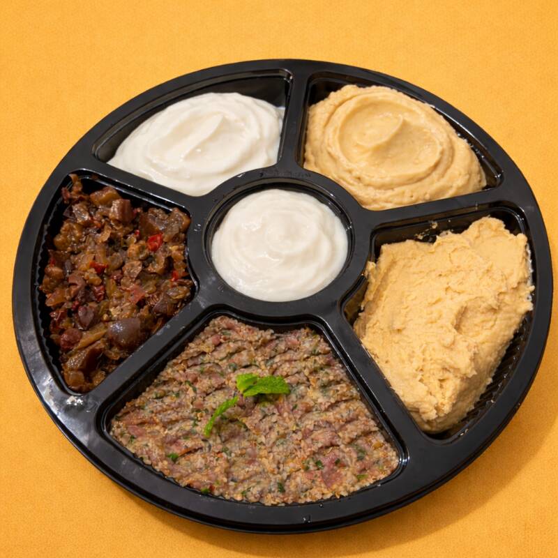 Esse é perfeito para compartilhar! Bandeja com nossas pastinhas deliciosas (todas as opções), quibe cru temperadinho e molho toum (emulsão de alho)