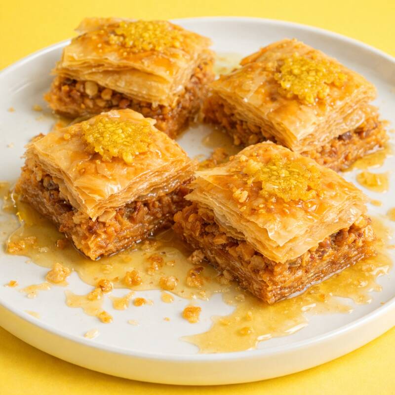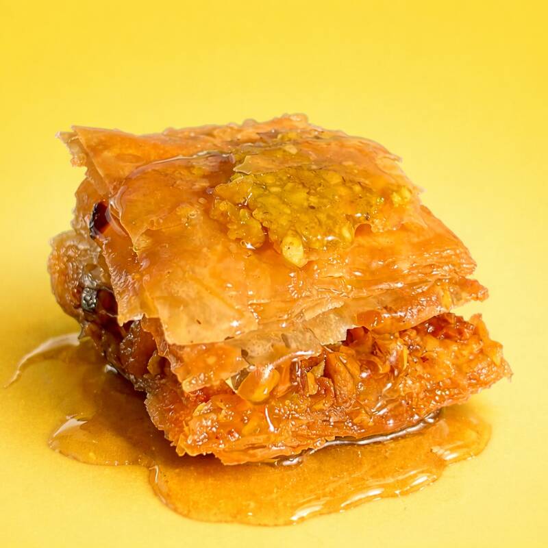 Massa folhada com recheio de pistache e calda de flor de laranjeira. Tamanho médio