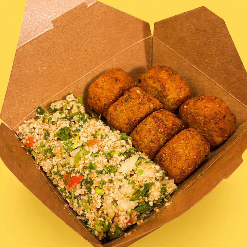 Porção de falafel crocante e saboroso (6 un) com a salada tabule (200g) refrescante e fresquinha da Hafiza!