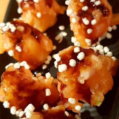 Salmão com a base de arroz. Por cima vem tartar de salmão, flocos de arroz e teriyaki, também acompanha cream cheese.