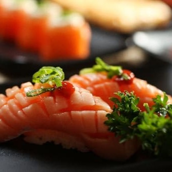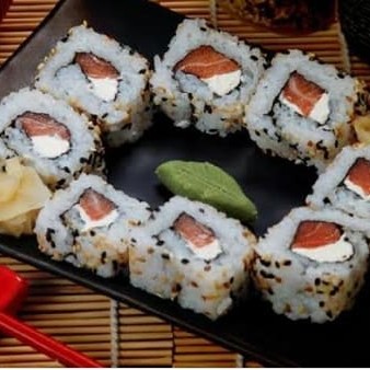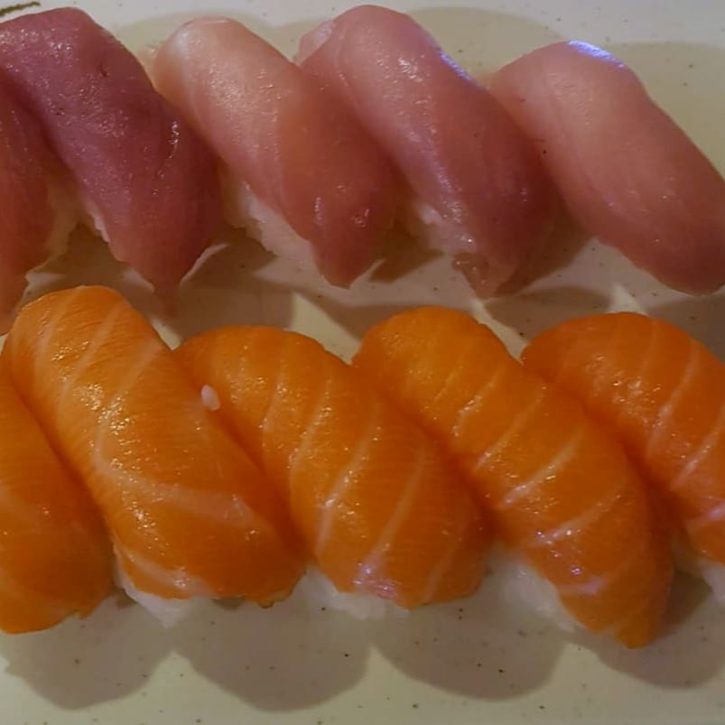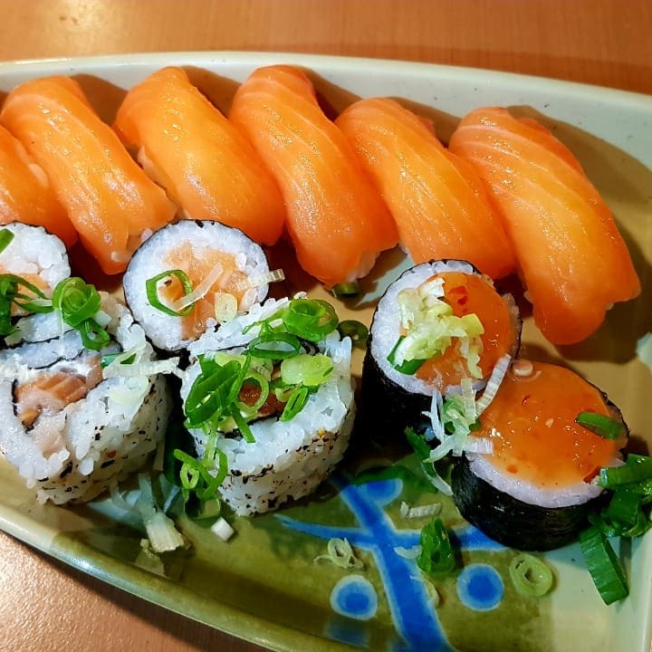 06 sushi, 02 spice tuna, 02 filadelfia e 02 salmão maki.