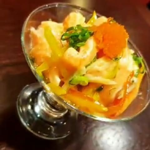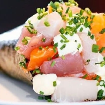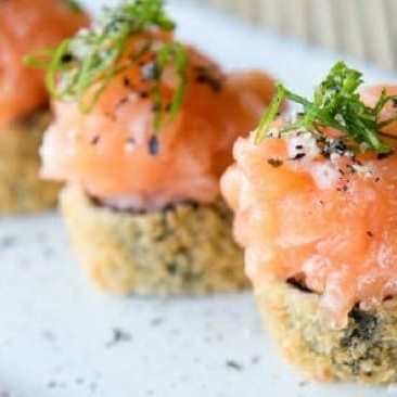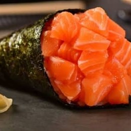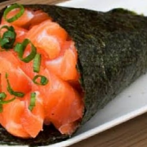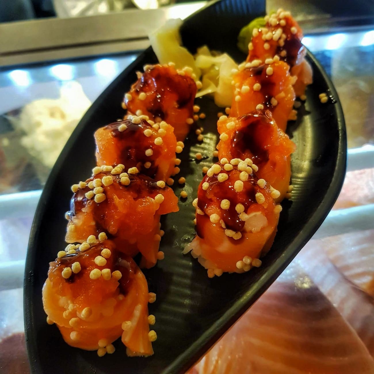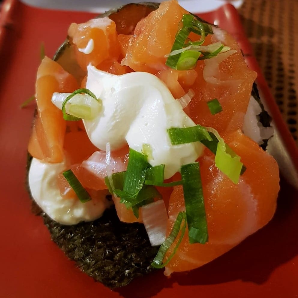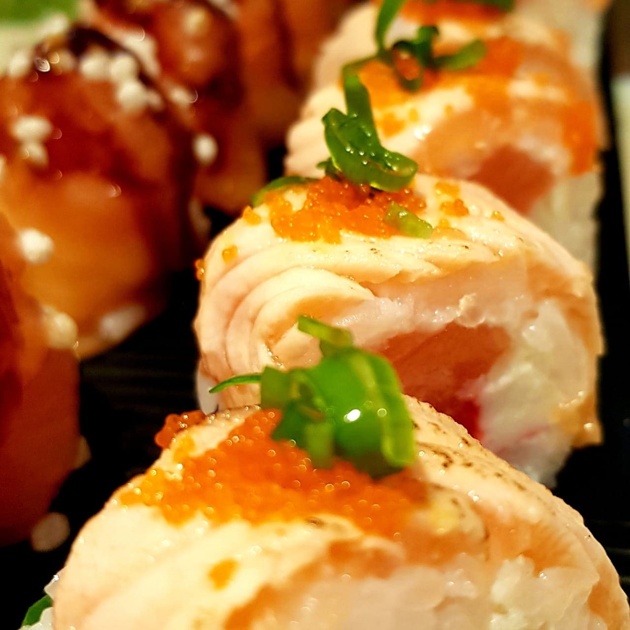 Lâminas de salmão maçaricado, com recheio de salmão, kani e cream cheese. Acompanha ovas de massago.