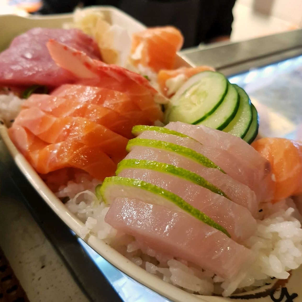 5 sashimis salmão, 3 sushis de camarão, 2 gueixas, 4 salmão skin e 4 tekka maki.
