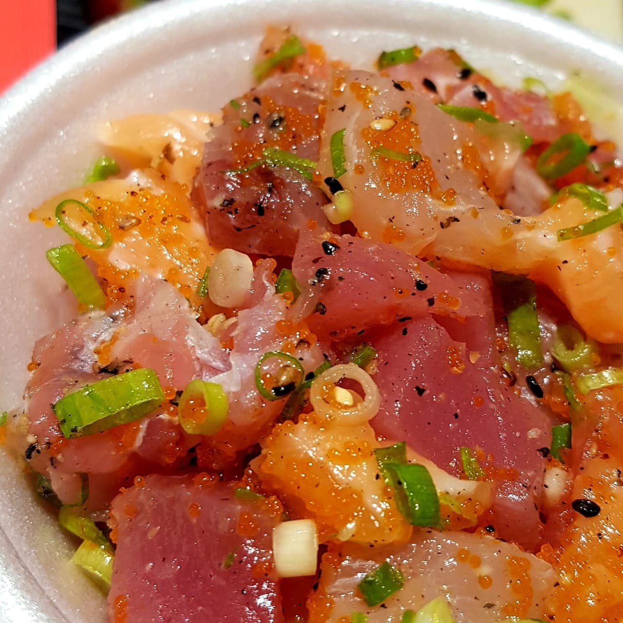 Por cima do hot vem picadinhos de salmão e atum misturado com molho teriyaki.