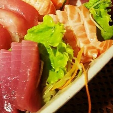 Um prato típico da culinária japonesa composto por 15 sashimis variados entre salmão, atum, peixe branco, acompanhando arroz shari .