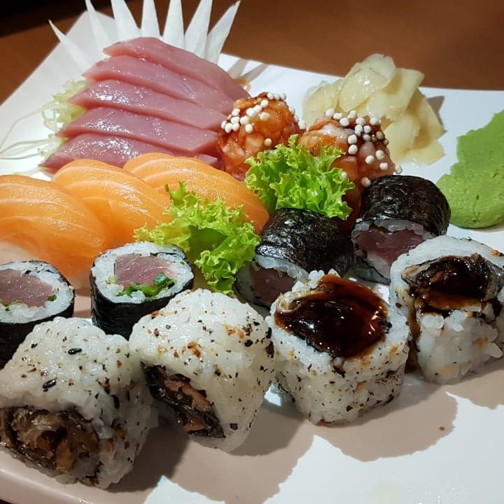 20 sashimi, 10 sushi, 4 salmão maki, 4 spicy, 4 califórnia e 4 filadélfia Combinado geralmente variado entre salmão, atum e peixe branco.
