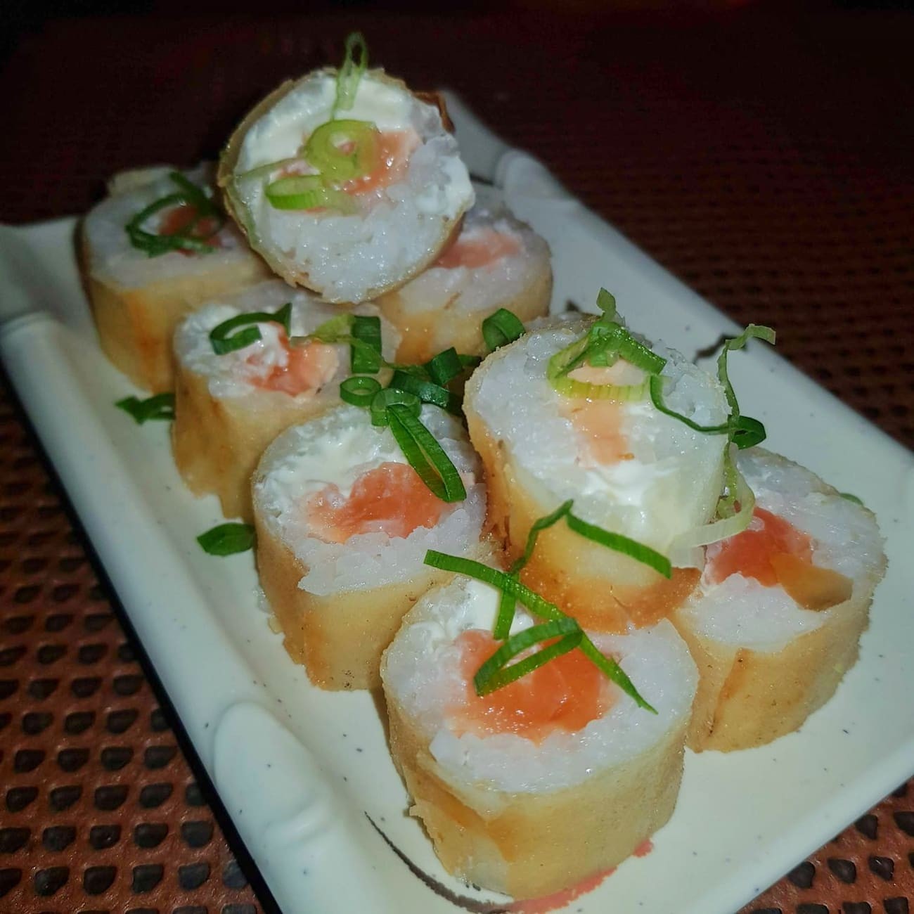 empanado por fora acompanha salamão ou atum, cream cheese, cebolinha e gergelim .