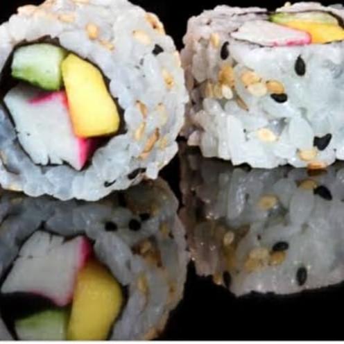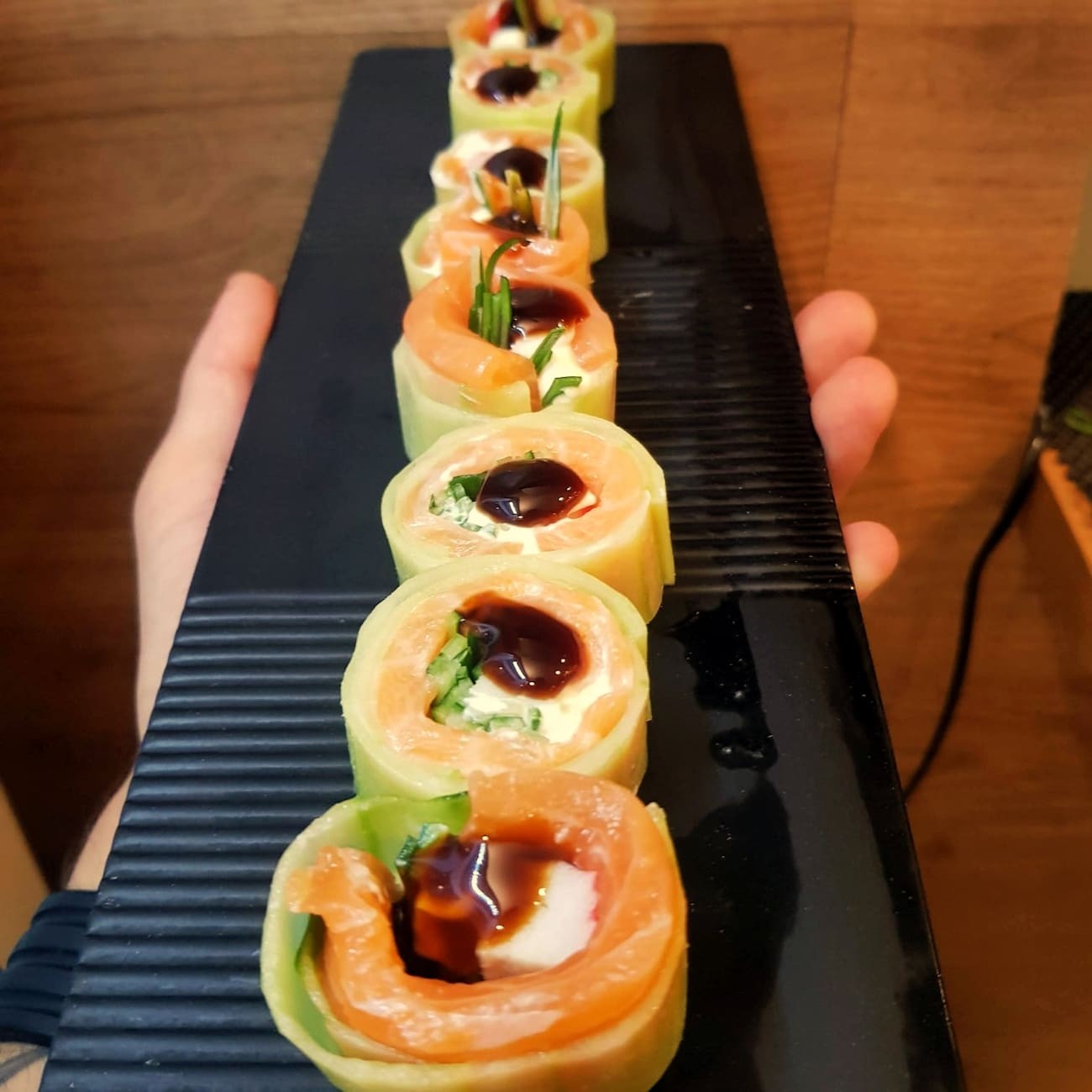 Salmão envolto com lâminas de pepino recheado com kani e cream cheese também.