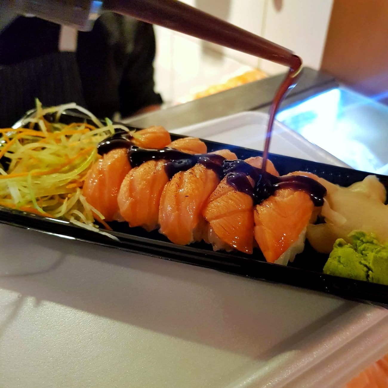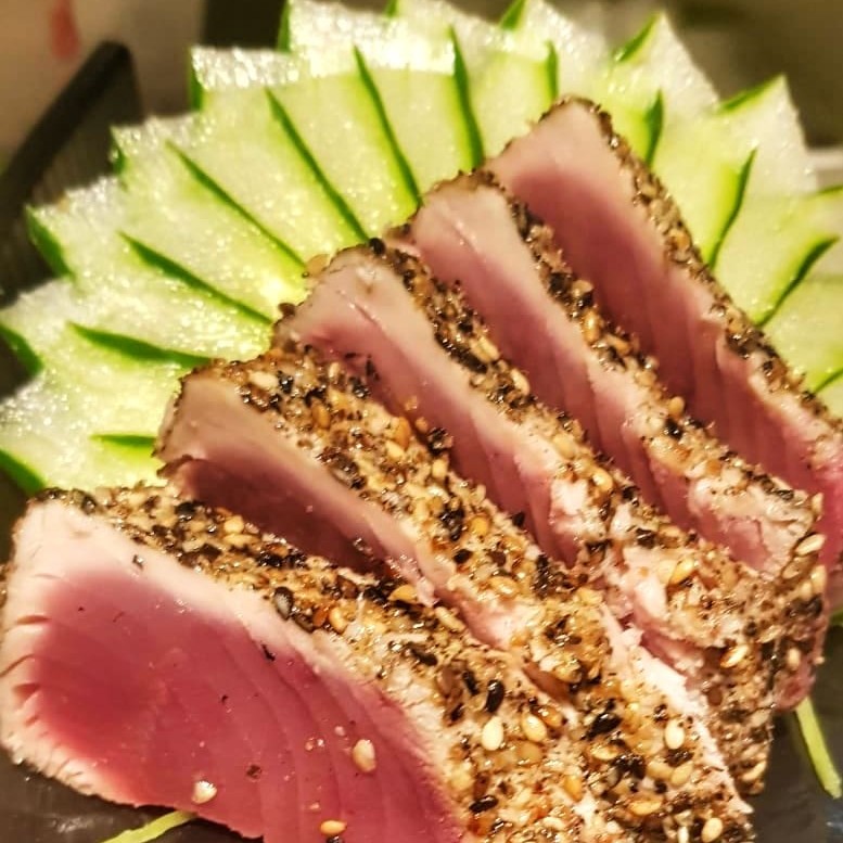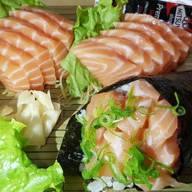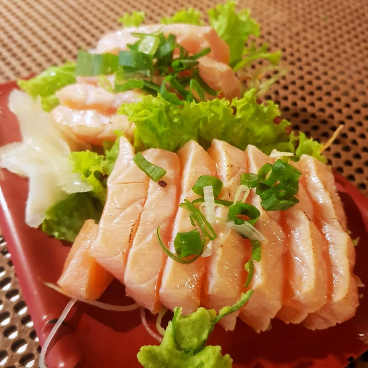 Sashimi maçaricado, acompanha teriyaki e gergelim.