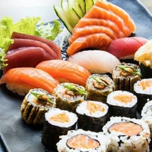 15 sashimi, 10 sushi, 08 hot, 04 salmão skin, 04 salmão maki e 04 filadelfia, 05 hot tartar Combinado geralmente variado entre salmão, atum e peixe branco.