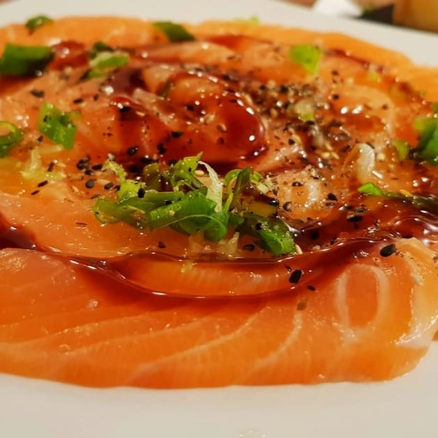 Lâminas de salmão temperadas com molho teriaki, gergelim e cebolinha.